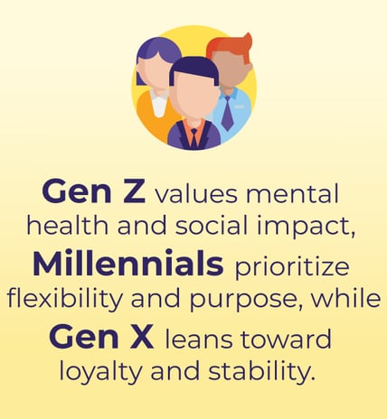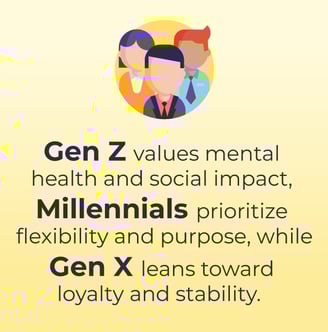 Gen X prioritises loyalty and stability, Millennials seek flexibility and purpose, while Gen Z values mental health and social impact.